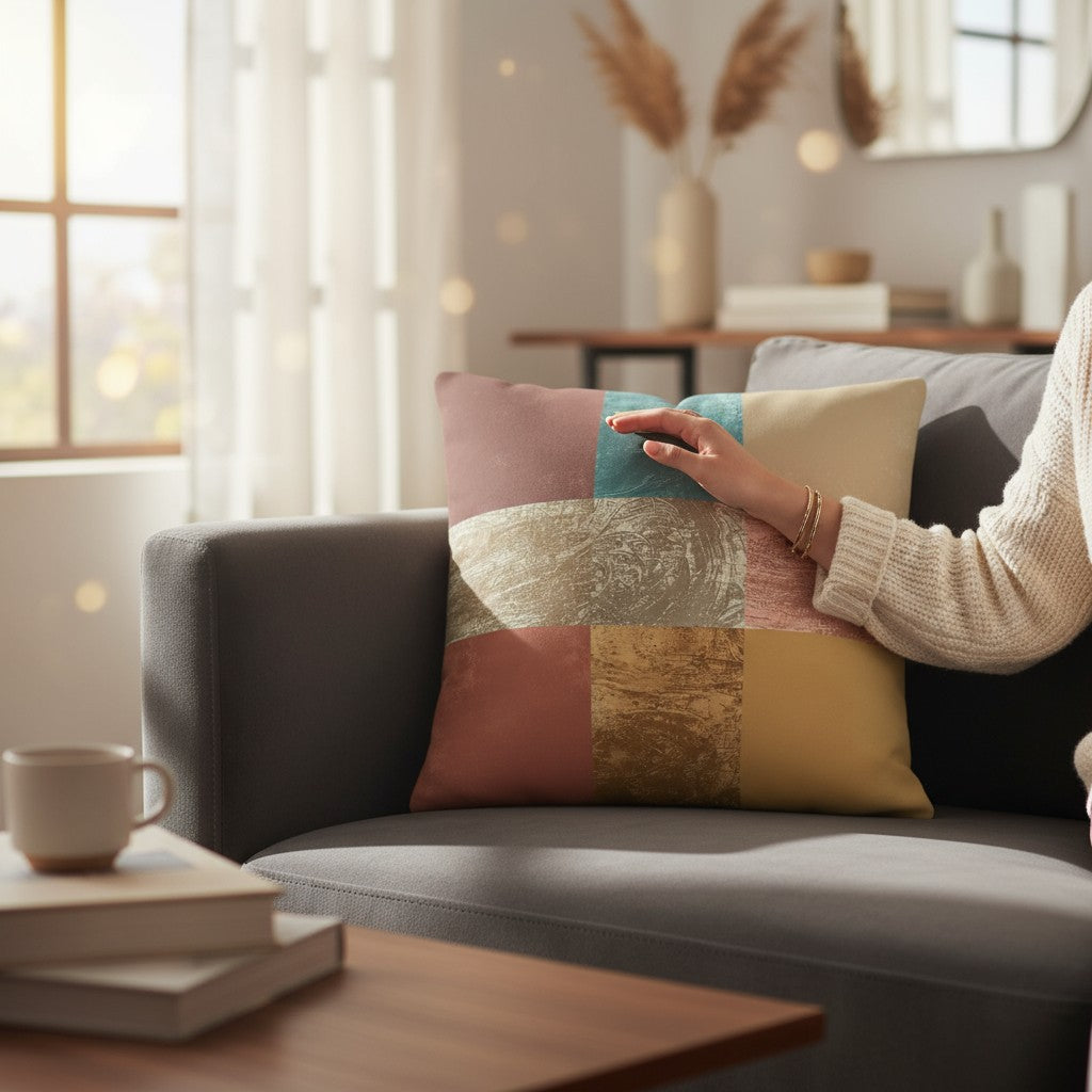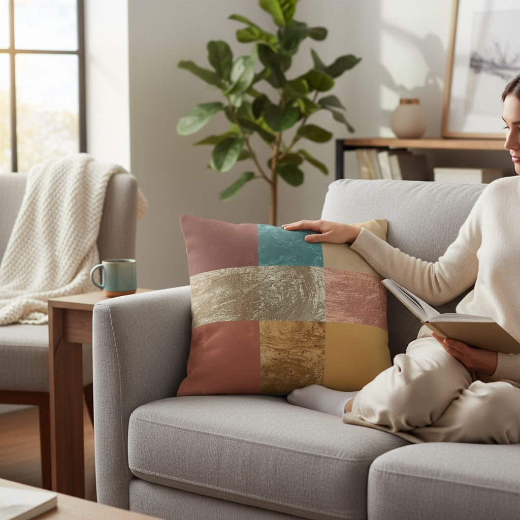 Modern simplicity meets handcrafted warmth in “Color Balance”, a fine-art pillow featuring a geometric mosaic of textured CMYK color planes. Each block reveals tactile depth in tones of copper, turquoise, sand, and ochre — harmonizing vibrant energy with soft minimalism.